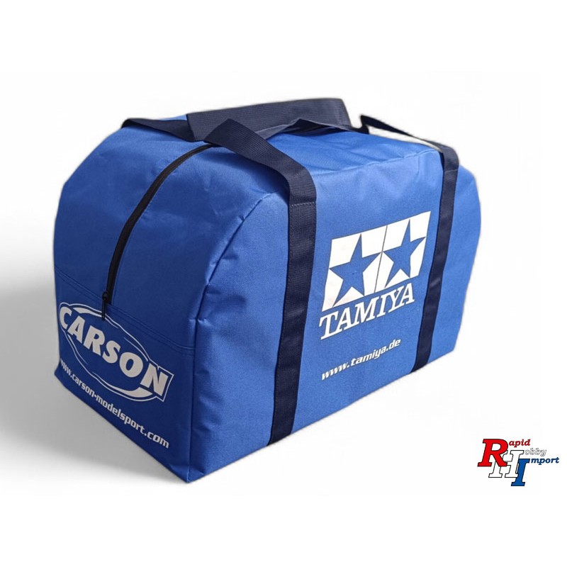 - Robuust nylonmateriaal: De tas is gemaakt van duurzaam, waterafstotend nylon en is uitgevoerd in een opvallend Carson-blauw met Tamiya- en Carson-logo.
