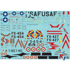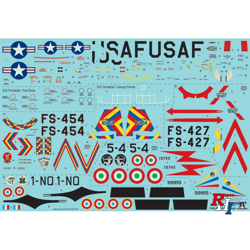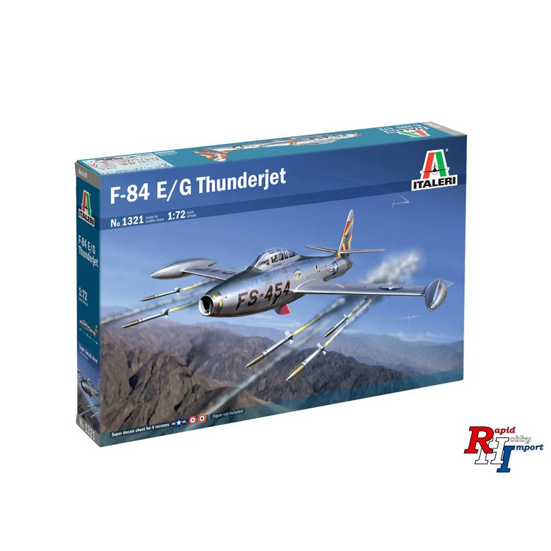 Die F-84 Thunderjet wurde unmittelbar nach dem Zweiten Weltkrieg von der US-amerikanischen Firma Republic entwickelt, die der US Air Force ein neues Projekt für einen Jagdbomber mit Strahlantrieb anbieten wollte. Die aerodynamische Struktur war einfach, aber sehr effektiv und robust, mit einem großen kreisförmigen Lufteinlass an der Vorderseite, geraden Tragflächen und einem Bugradfahrwerk. Das General Electric/Allison J35-Triebwerk ermöglichte der F-84 eine Höchstgeschwindigkeit von 1.000 km/h. Die F-84G, die 1951 in Produktion ging, stellt eine der letzten Versionen des Republic-Jagdbombers dar. Sie wurde nicht nur von der US Air Force eingesetzt, sondern auch von vielen NATO-Staaten im Rahmen des Mutual Defense Assistance"-Programms. Ab 1952 wurde sie bei mehreren Jagdverbänden der italienischen Luftwaffe eingeführt. Sie war mit sechs 12,7-mm-Maschinengewehren bewaffnet und konnte eine Offensivlast von fast 900 kg tragen.