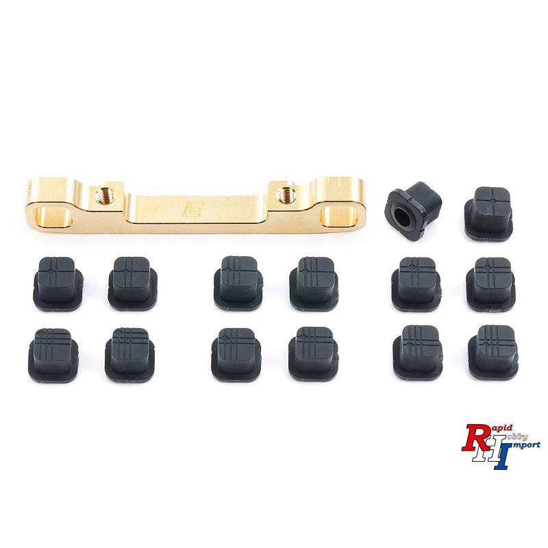 These are heavier brass versions of the TAMIYA new adjustable suspension mount designs found on the TRF420 chassis kit. The brass version will add extra weight compared to aluminum counterparts. There are three different types of mount, each with different dimensions. The included bushing sprue contains 7 pairs of different bushing types, each type with a different hole for the suspension shafts, giving a total of 25 potential shaft offset positions to fine tune your TA-07, TB-05, TRF419, and TRF420 to different track configurations and conditions.