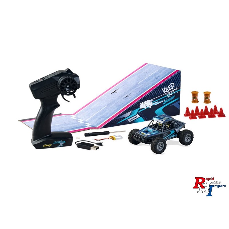De 1:32 Deemon X is de ideale mini RC-metgezel voor thuis en in de tuin. De eenvoudig te besturen kleine 2WD RC-buggy heeft twee snelheidsinstellingen en is uiterst wendbaar. Dankzij de LED-verlichting van het voertuig, die via de zender kan worden in- en uitgeschakeld, is de Deemon X altijd klaar voor actie, zelfs in het donker. De rubberen banden met veel grip zorgen voor voldoende tractie, zelfs op oneffen oppervlakken. Naast de visueel verbeterde springhelling die bij het voertuig past, omvat de leveringsomvang een 2,4 GHz 3-kanaals afstandsbediening, een LiPo-aandrijfbatterij, gereedschap en verschillende pylonen voor het opzetten van een racebaan. Na een lange rijtijd van 15 minuten kunt u de kleine speedster gemakkelijk opladen via een USB-kabel. Kopen opladen rijden!